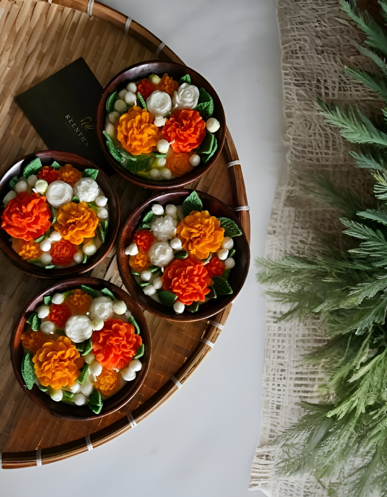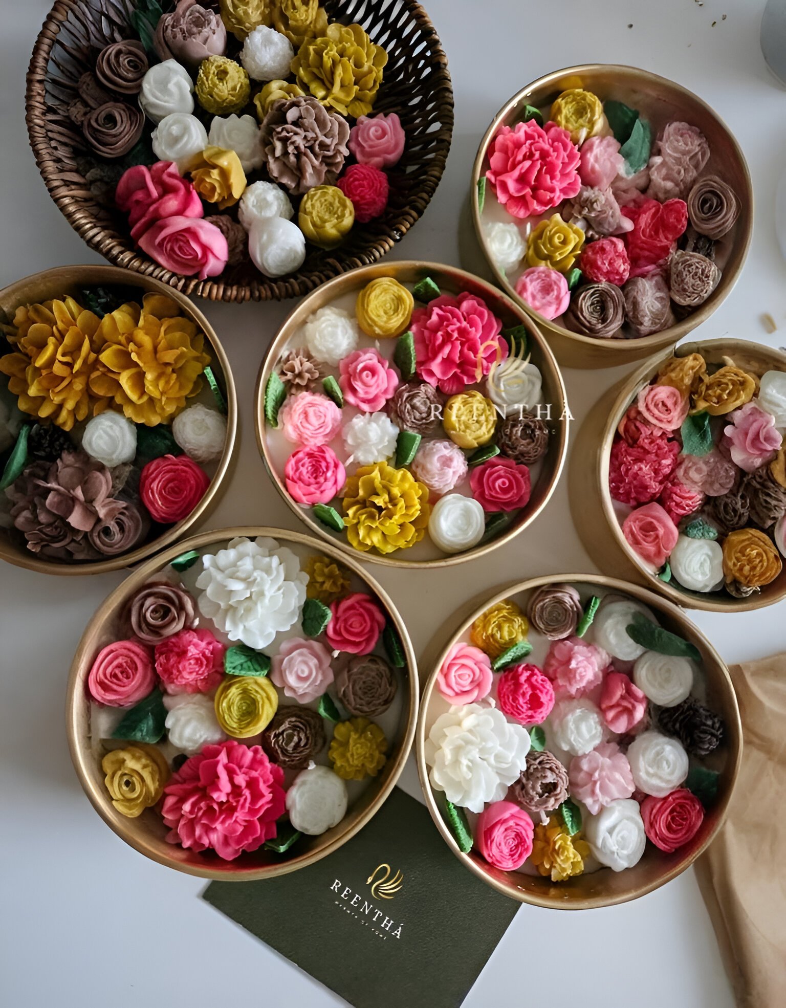 Bring the beauty of a blooming valley into your home with Reentha’s Valley of Flowers Candle. Crafted with 500 gm of premium wax, this exquisite candle features a garden of hand-molded flowers in vivid hues, each petal designed to perfection. The elegant gold vessel complements its luxurious look, making it a statement piece for your décor.